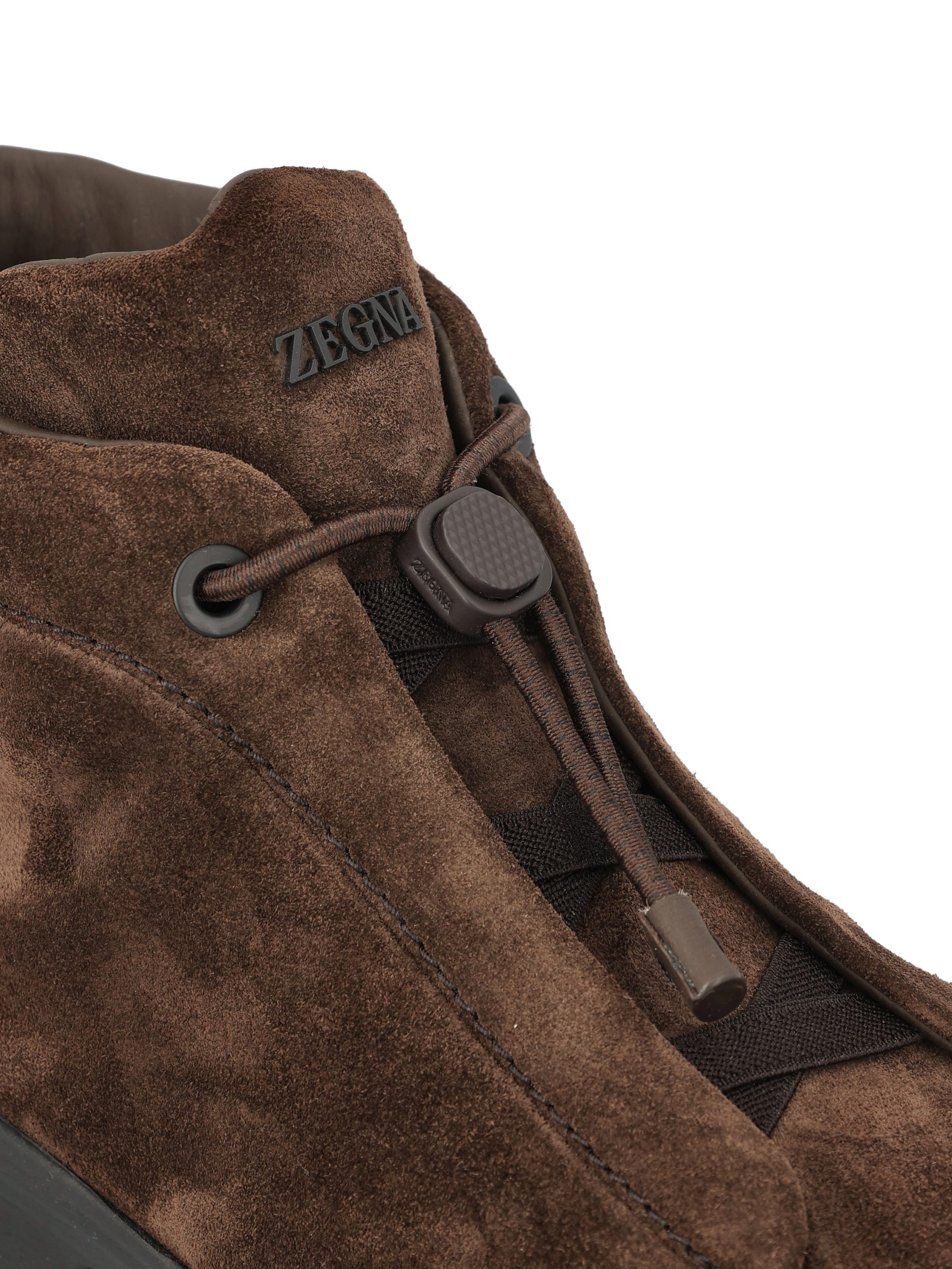 Ботитнки из замши ZEGNAТройные стежки Vetta от Zegna представляют собой идеальный союз спортивного духа и мастерства. Изготовленные из мягкой темно-коричневой замши, они имеют характерный дизайн без шнуровки с тремя перекрестными эластичными лентами, что является отличительным символом коллекции. Толстая легкая подошва обеспечивает комфорт и стабильность, что делает эти кроссовки идеальными для повседневного и изысканного образа с современным оттенком.- Верх: замша