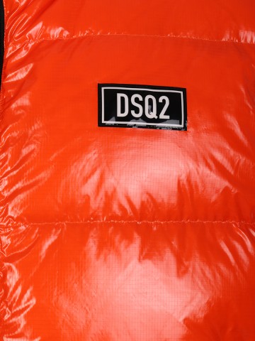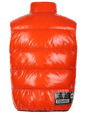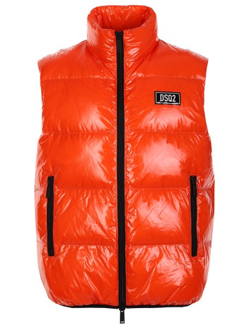 Жилетка DSQUARED2Оранжевый стеганый жилет с натуральным пуховым наполнителем от DSQUARED2 прямого кроя. Высокий воротник-стойка, прорезные карманы и застежка на молнию с двумя пуллерами. Логотип на груди. Стежка обеспечивает равномерное распределение тепла. Натуральный пух отлично сохраняет тепло.